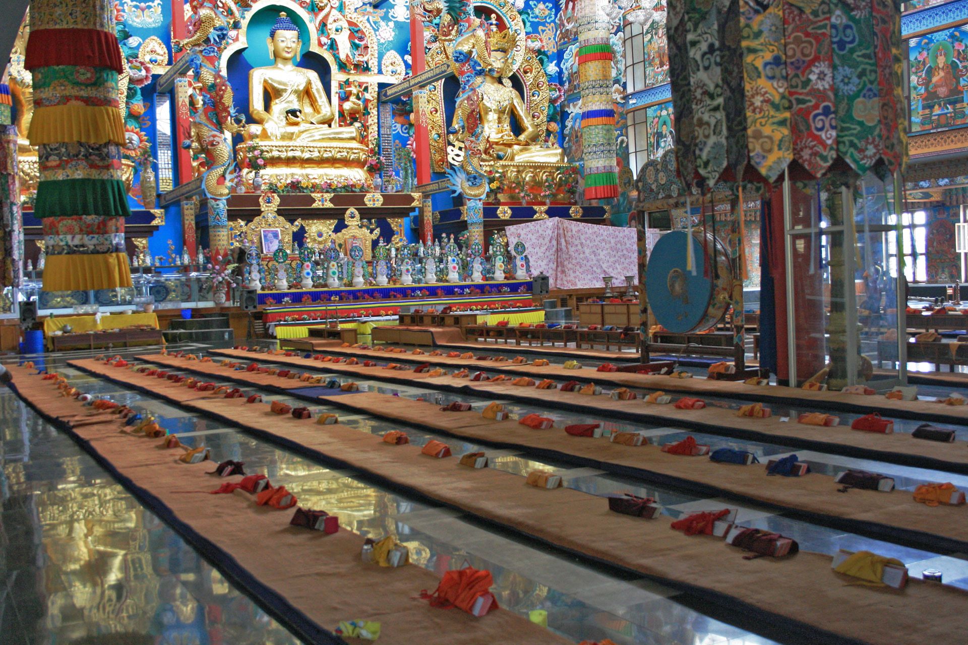 Bylekuppe near Kushalanagar is one of the largest Tibetan settlements in south India. It has several monasteries and the prominent among these are the Great Gompa of Sera Je and Sera Mey and the Namdroling monastery. The Mahayana Buddhist University is at Sera. Another important monastery is the Tashi Lhumpo monastery, the seat of the Panchen Lama. The gold-coated Buddhist statues in the monastery are imposing and unique, reflecting the rich cultural heritage of the Tibetans. This is a restricted area and prior permits must be obtained for foreigners to visit the temples.